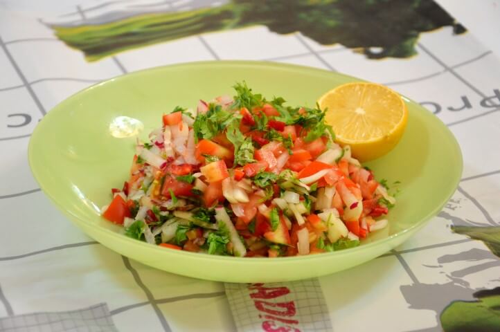 סלטים חיים לשבת מרעננים וחריפים. עגבניות בשלות, בצל ירוק, פלפל חריף ושום, מתובלים בשמן זית ולימון. סלט ארץ ישראלי אמיתי, פשוט וטעים. הסוד: השתמשו בעגבניות בשלות לגמרי בטמפרטורת החדר לטעם מיטבי.
