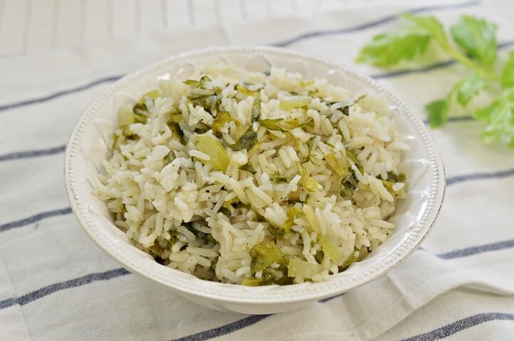 - מוסיפים את האורז והשום הכתוש ומערבבים כדקה. מוסיפים עלי סלרי ומערבבים.