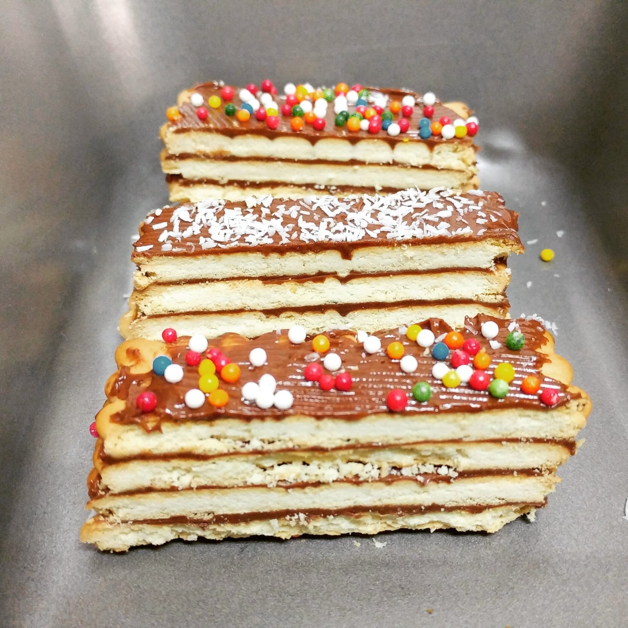 - מעל מורחים שכבה אחידה של ממרח שוקולד. מעל מסדרים שכבה נוספת של ביסקוויטים. כך ממשיכים 4 שכבות כאשר השכבה העליונה היא ממרח. מפזרים מעל סוכריות צבעוניות לקישוט, עוטפים בניילון נצמד או נייר כסף ומכניסים למקפיא למשך 3 שעות לפחות.