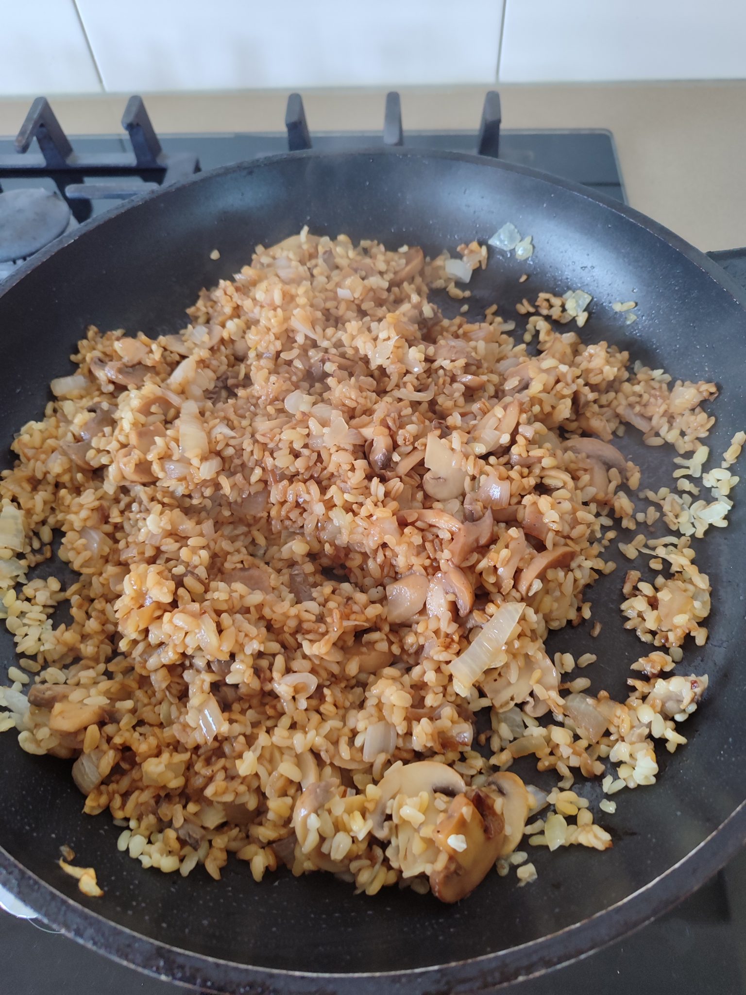 - מוסיפים את הבורגול ומתבלים במלח, סויה, סילאן, פלפל שחור וצ’ילי. מבשלים תוך כדי ערבוב במשך 2-3 דקות, לספיגת הטעמים.