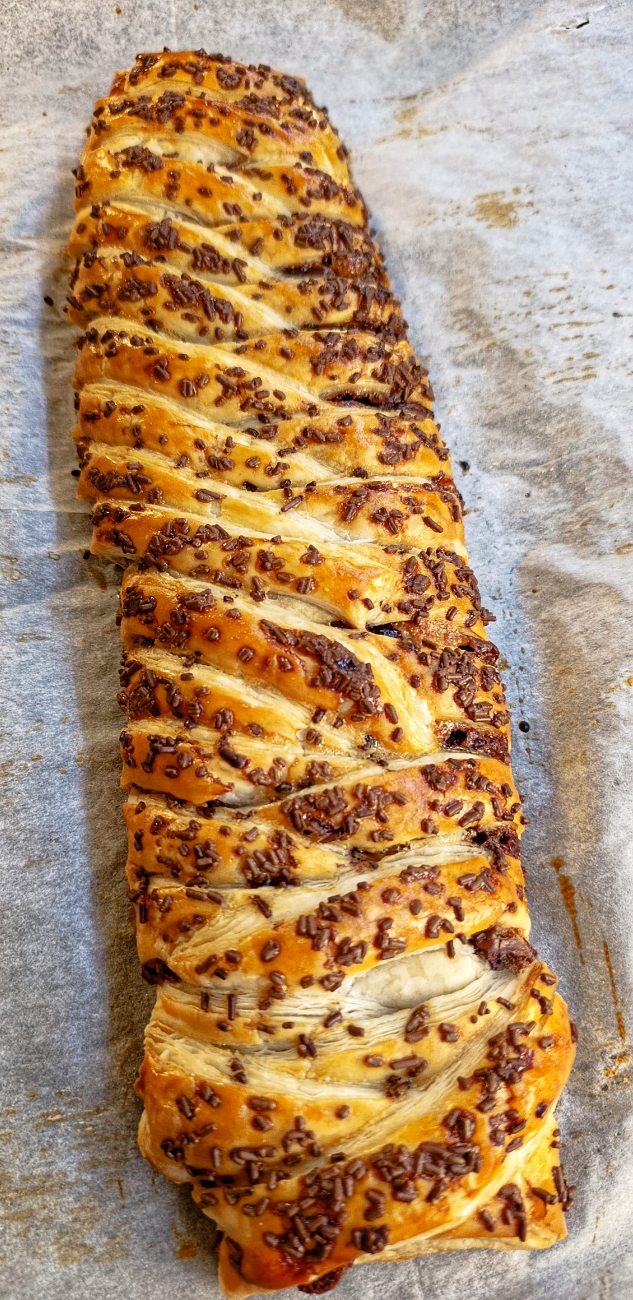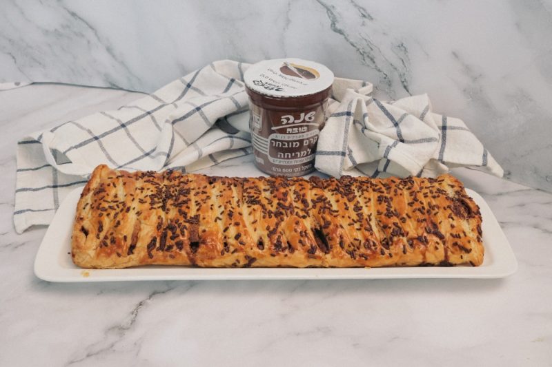 - חותכים את הבצק משני הצדדים (עד המילוי) לרצועות בעובי כ-2 ס”מ וסוגרים את הרצועות מעל המילוי, אחת מימין ואחת משמאל לסירוגין.