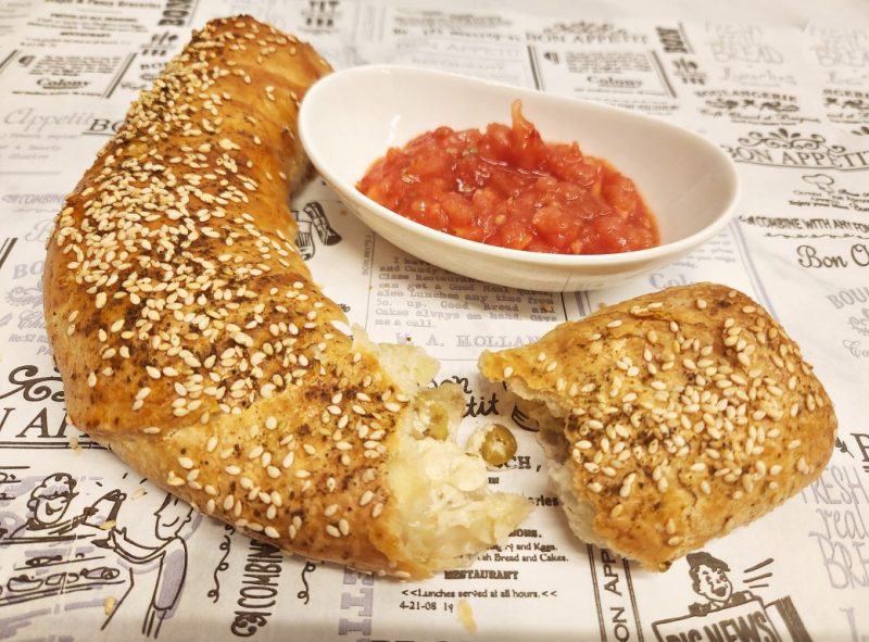 - מניחים את המלית לאורך, מקפלים את הקצוות ומגלגלים לרולדה. מותחים מעט את הרולדה ומקפלים לצורה של חצי ירח. מורחים בביצה טרופה ומפזרים מעל מעט שומשום וזעתר.