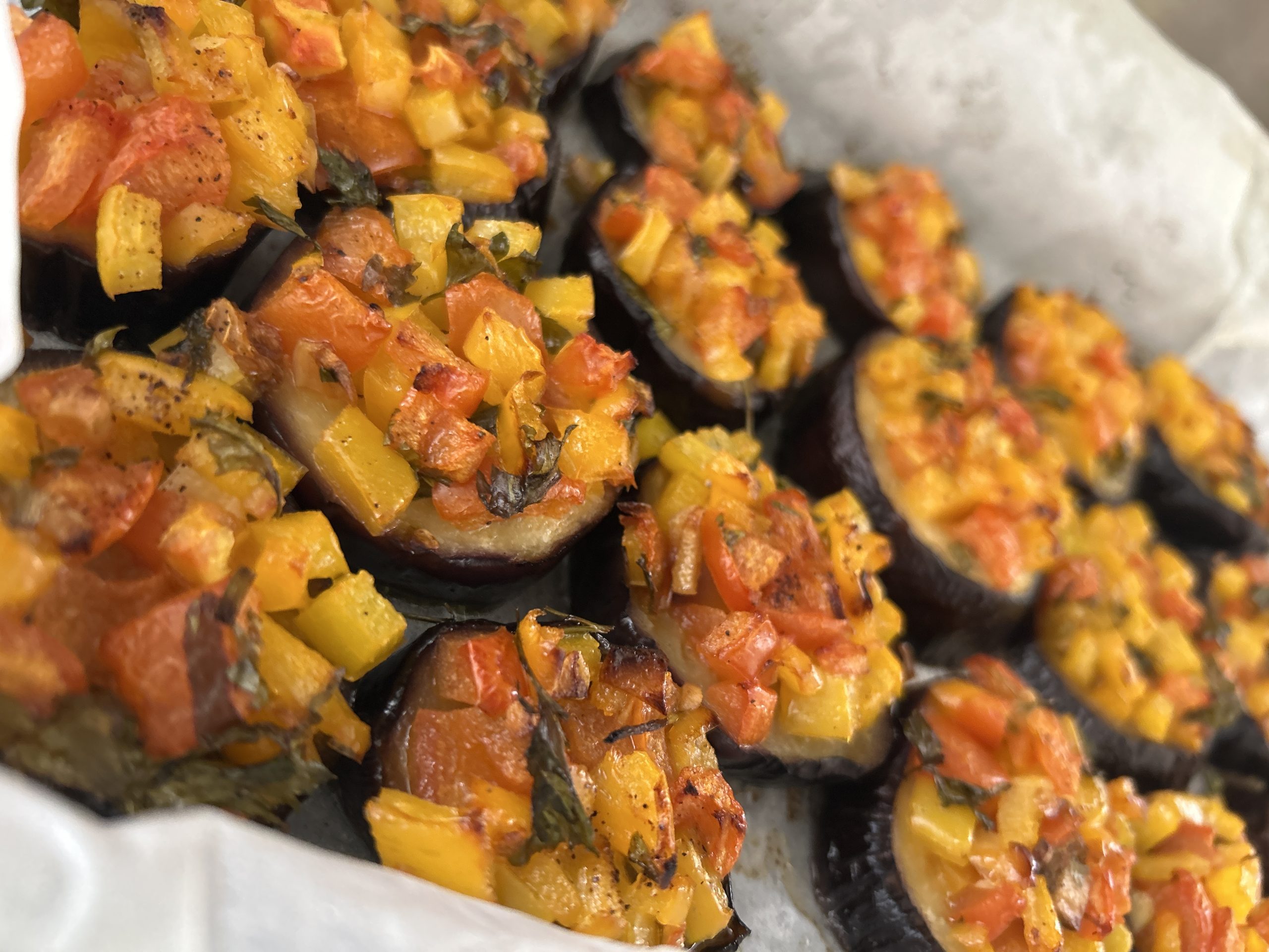 - מברישים את פרוסות החצילים בשמן זית משני הצדדים ומניחים על נייר האפיה. מערבבים בקערית את העגבניה, הגמבה, השום והעלים הקצוצים ומפזרים מעל כל פרוסה. מפזרים מעט מלח ופלפל שחור ומכניסים לתנור למשך שעה.