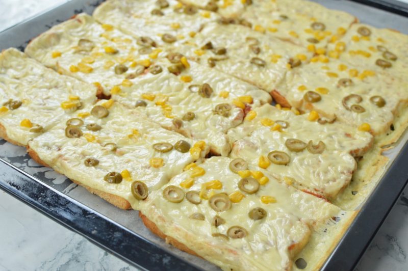 2. מרפדים את תבנית התנור בנייר אפיה ומניחים את פרוסות הלחם אחת ליד השניה (צמוד).