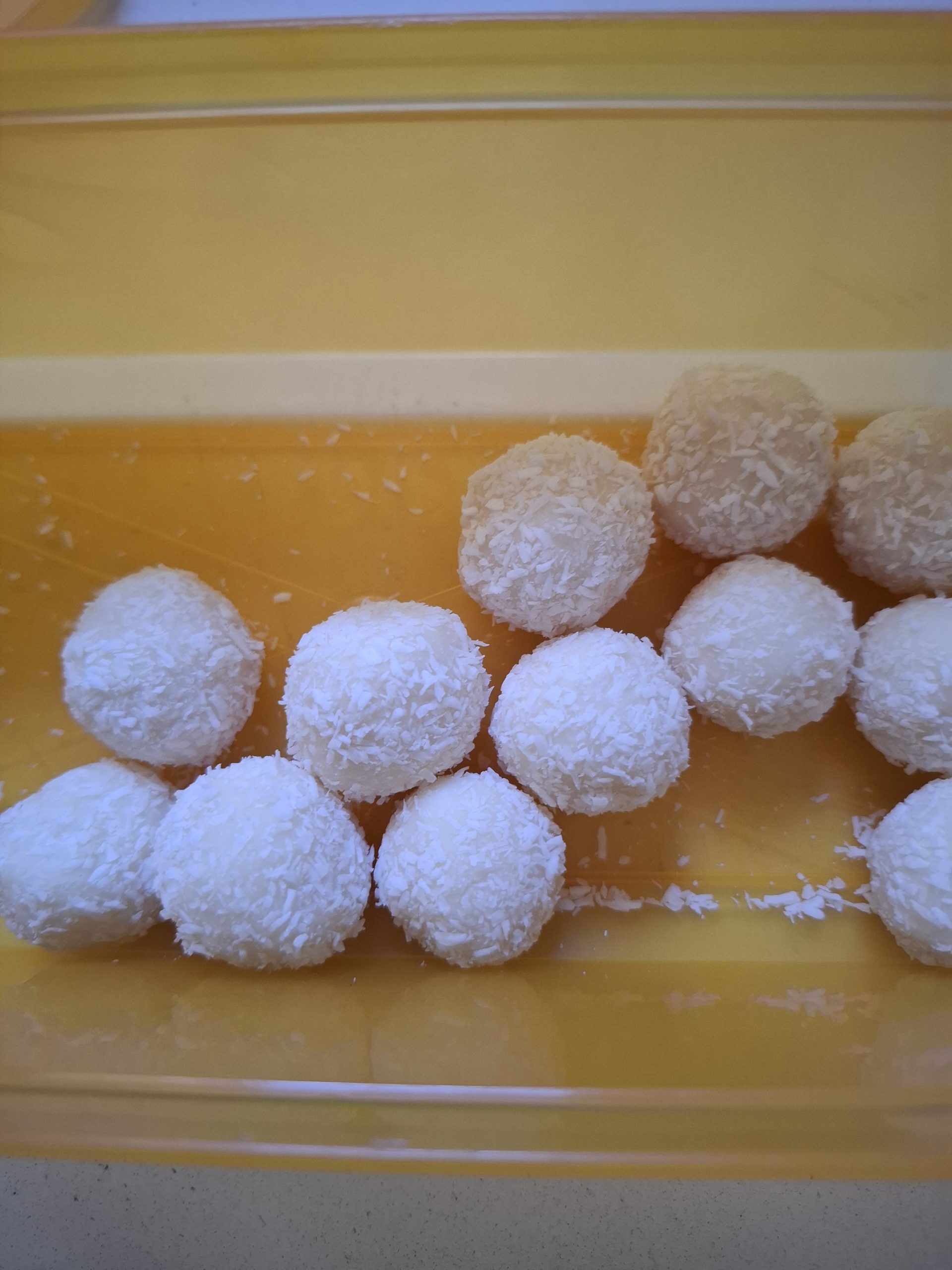 - משתמשים בכפית כדי ליצור עיגולים מהשוקולד ומגלגלים אותם במהירות בעזרת הידיים לכדורים קטנים בקוטר של כ- 2 ס”מ. מגלגלים בקוקוס.