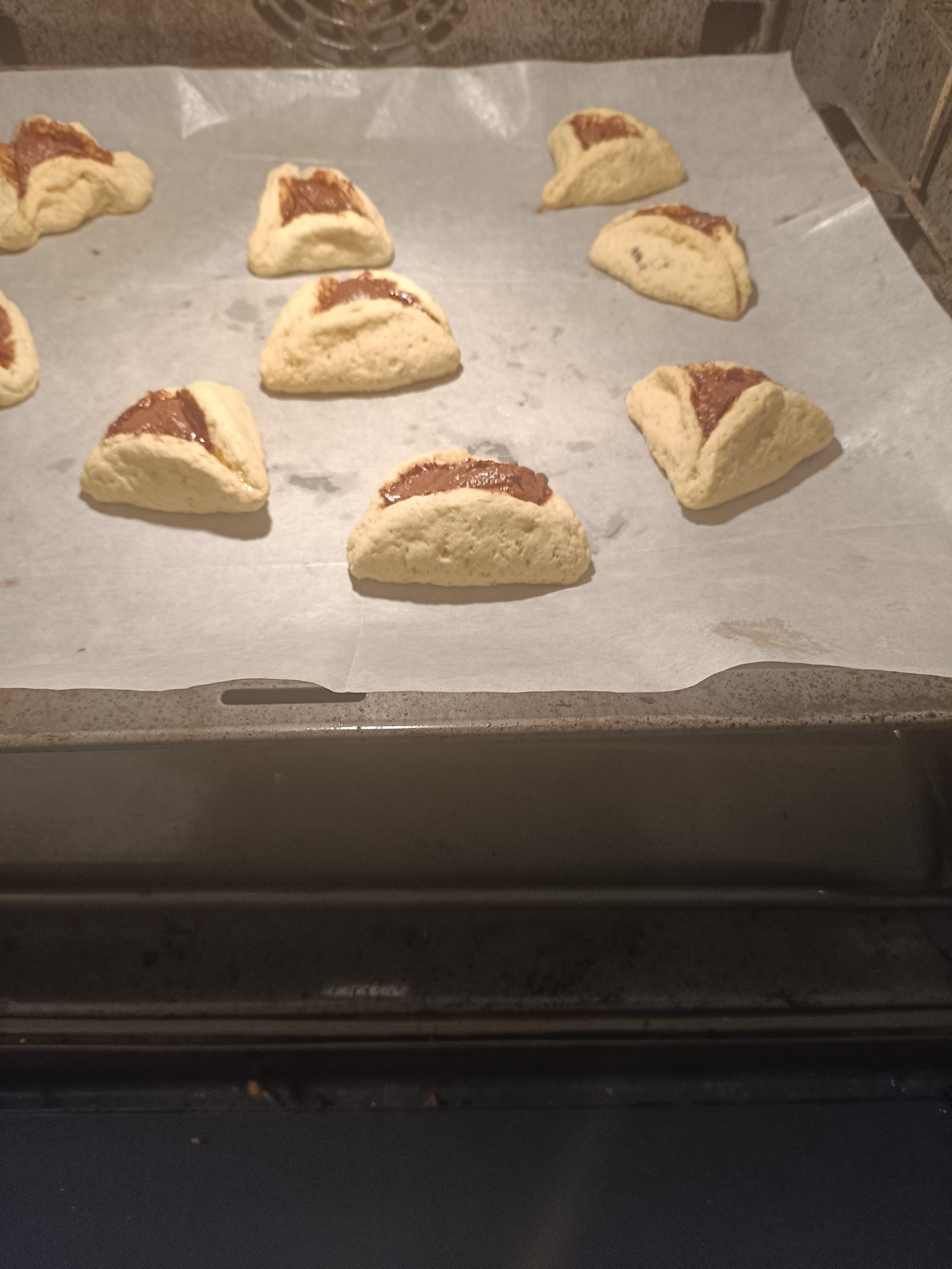 - סוגרים כל עיגול למשולש ומהדקים היטב את השוליים (אחרת ייפתחו בזמן האפייה).