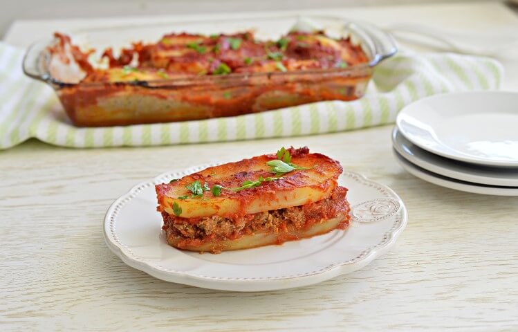 - משמנים תבנית ומניחים את פרוסות תפוחי האדמה. מעל כל פרוסה יוצקים שכבה עבה של תערובת בשר. מעל מכסים בפרוסה נוספת של תפוח אדמה (כמו סנדוויץ’). יוצקים את רוטב העגבניות מעל ומשטחים. עוטפים בנייר אלומיניום (כסף) ומכניסים לתנור שחומם מראש על 200 מעלות במשך 45 דקות.
