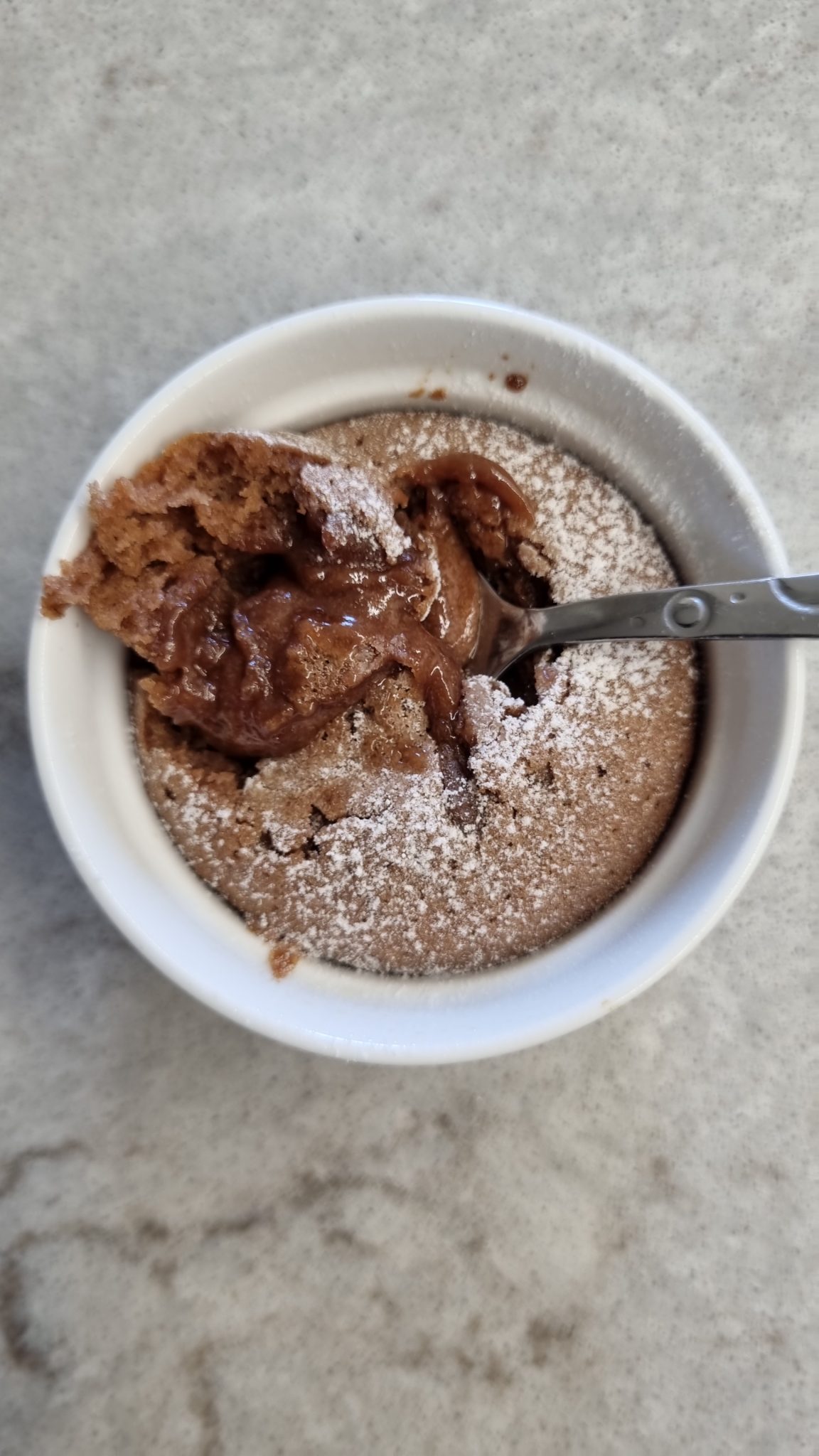 - מכניסים לתנור ואופים במשך 10-12 דקות, עד שהצדדים אפויים, בפנים נוזלי ומלמעלה יש קרום אפוי (כדאי להשתמש בסטופר שכן אפית יתר תהפוך את הסופלה למרקם עוגתי יבש ולא נוזלי מבפנים).הפעל טיימר (10 דק’)+טיימר פועל