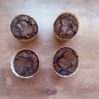 - משמנים כוס או תבנית שקעים ויוצקים את התערובת לגובה שני שליש. מטמינים בכל שקע קוביית שוקולד.