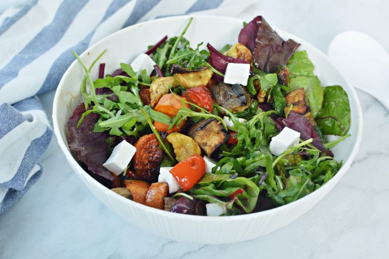 3. מניחים בקערת סלט עליי בייבי ומוסיפים את הירקות האפויים. מתבלים בשמן זית, חומץ בלסמי, מלח ופלפל שחור. מפזרים מעל גבינה בולגרית ומגישים.