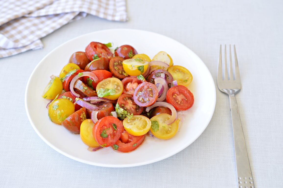 איך מכינים סלט עגבניות שרי ובצל סגול?