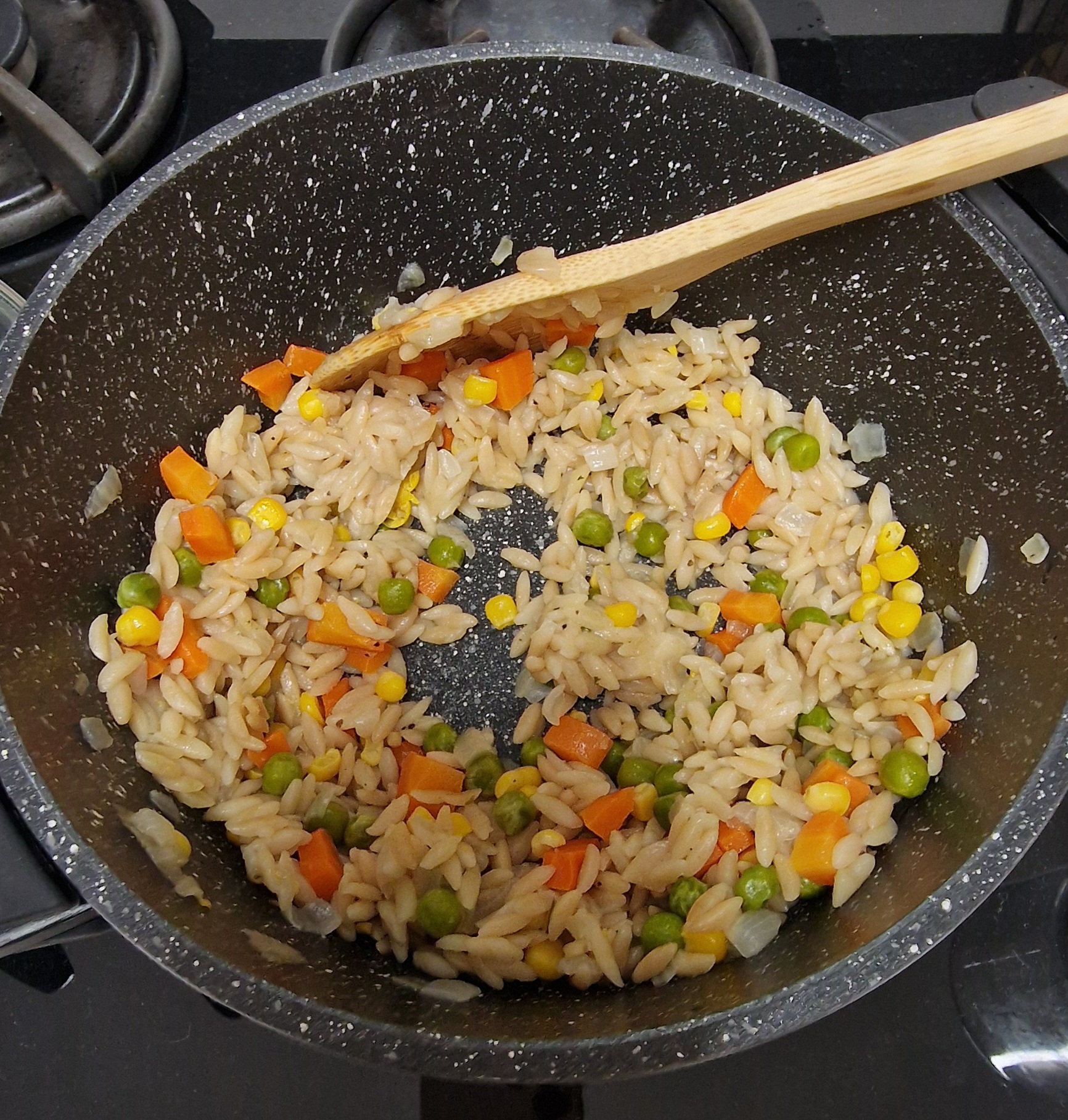 - מוסיפים אפונה וגזר וגריגרי תירס ומערבבים כדקה. מוסיפים את הפתיתים ומתבלים. מערבבים כדקה נוספת ומוסיפים מים רותחים. מביאים לרתיחה, מנמיכים את האש, מכסים ומבשלים במשך 10 דקות.הפעל טיימר (10 דק’)+טיימר פועל