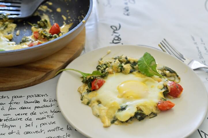 -בעזרת כף יוצרים בורות קטנים ולתוכם מוסיפים את הביצים. מכסים ומבשלים כ-3 דקות. מרימים את המכסה ומפזרים מעל גבינה צהובה מגורדת ובולגרית. מכסים את המחבת ומבשלים על אש בינונית-נמוכה במשך 2-5 דקות נוספות (לפי מידת העשייה הרצויה).