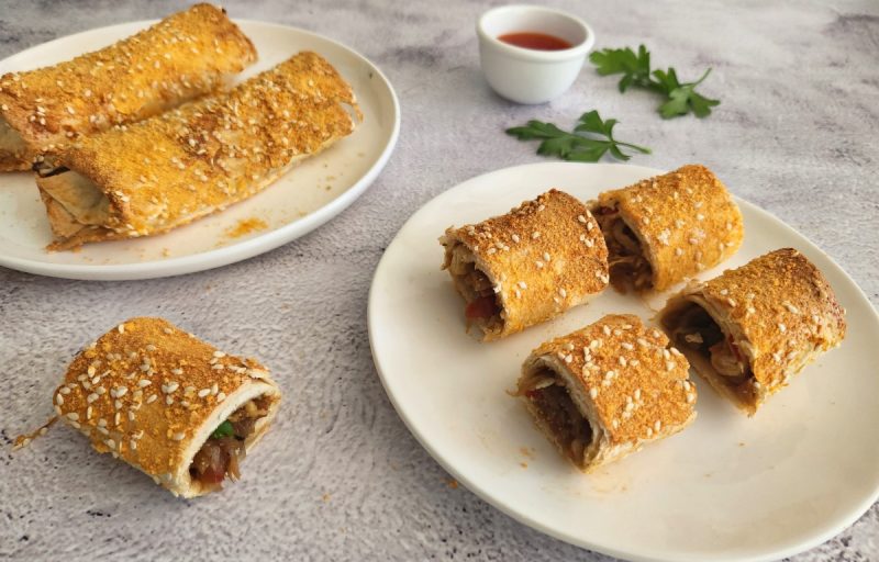 - מניחים בצד הטורטיה כ-2 כפות מתערובת הירקות (אם הטורטייה לא גמישה אפשר לחמם אותה כמה שניות במחבת או במיקרוגל), מקפלים את השוליים ומגלגלים לסיגר. בסוף הגלגול מורחים ביצה טרופה ומדביקים. מניחים בתבנית על נייר אפיה כאשר החלק המודבק פונה כלפי מטה.