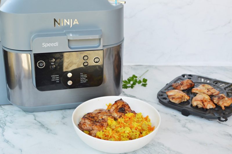 - פותחים את מכשיר הנינג’ה ספידי ומניחים בתחתית את האורז. מתבלים ב 3 כפות שמן ומערבבים. מוסיפים בצל, שום, גזר, וגרגירי חומוס. מתבלים בכורכום, כמון, מלח, אבקת מרק ופלפל שחור. מוסיפים מים רותחים ומערבבים.
