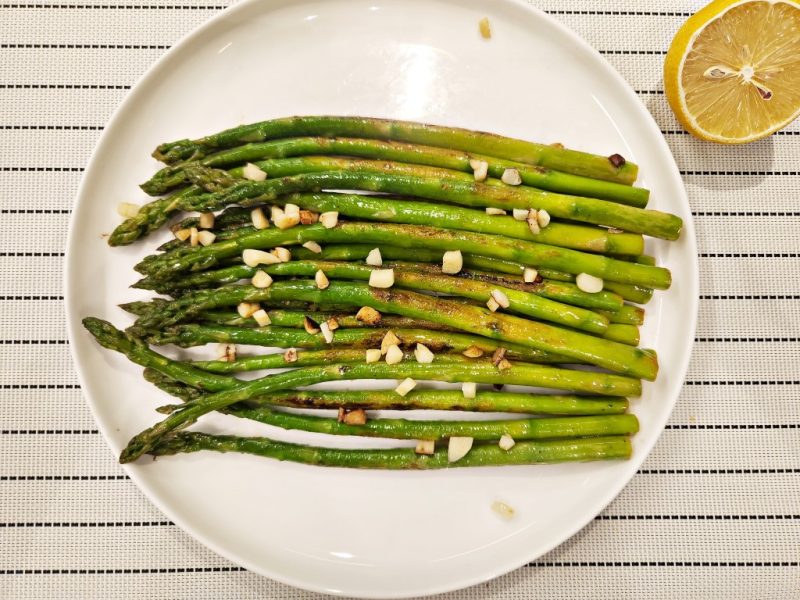 - מחממים מחבת על אש בינונית ומוסיפים 1-2 כפות שמן זית. מוסיפים את השום הקצוץ ומטגנים במשך כחצי דקה (יש לוודא שהשום לא נשרף). מוסיפים את האספרגוס, מתבלים במלח ומעט פלפל שחור וסוחטים מעל חצי לימון.