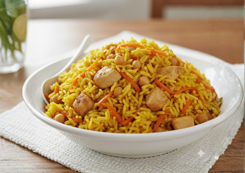 - מוסיפים את האורז, 2 כפות שמן נוספות ומתבלים בכורכום, כמון, מלח ופלפל. מערבבים היטב, מוסיפים את המים הרותחים ושוב מערבבים. משטחים מעט את התערובת ומביאים לרתיחה (כשהמים מעט מבעבעים).