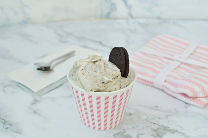 - כשהגלידה מוכנה יוצרים בעזרת כף חור בקוטר כ-4 ס”מ עד שמגיעים לתחתית הכוס וממלאים בעוגיות אוראו שבורות.