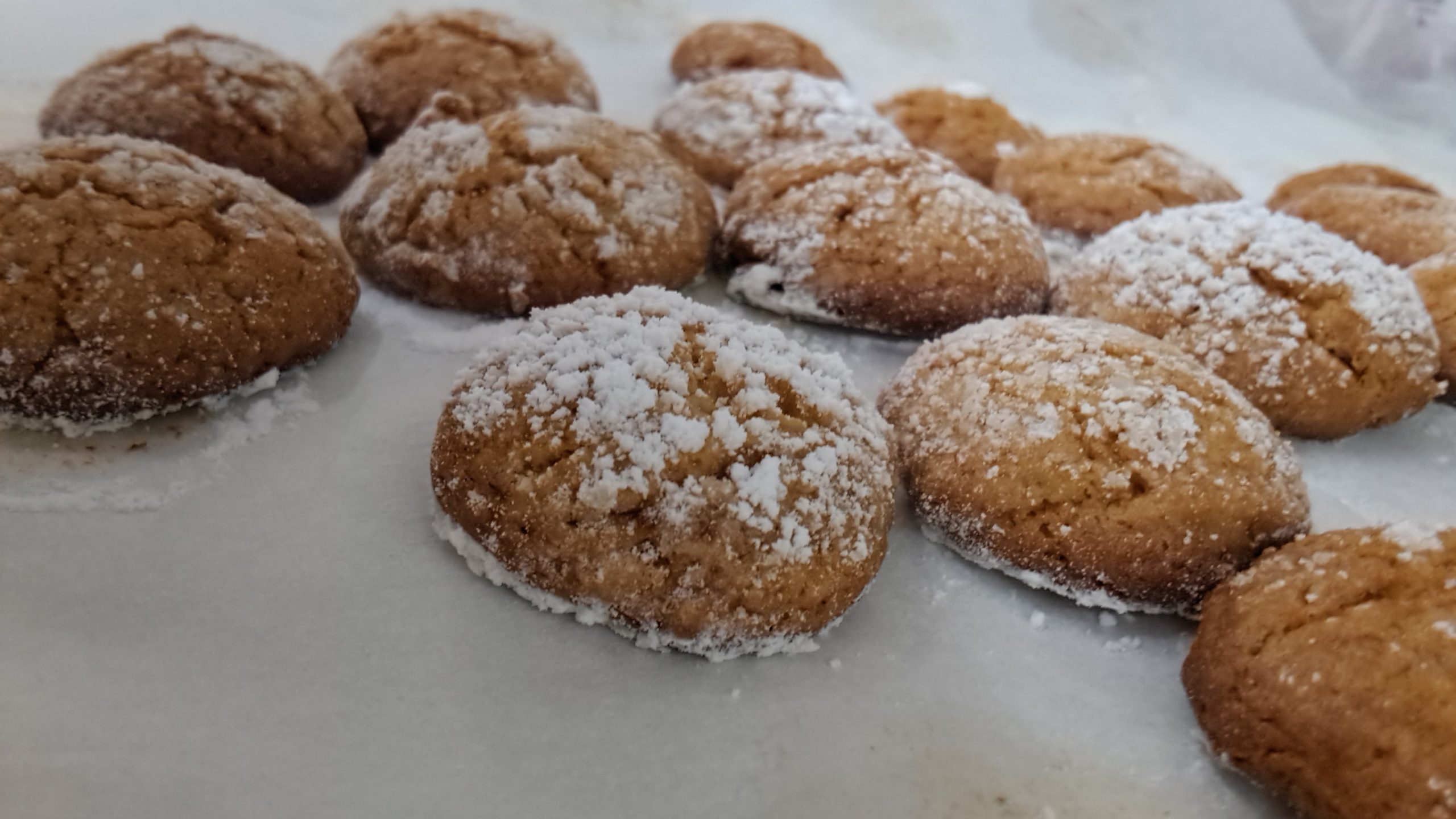 - פורשים נייר אפיה על תבנית התנור. יוצרים כדורים קטנים בקוטר של 2.5 ס”מ, מצפים באבקת סוכר ומניחים על נייר האפיה במרווחים קלים. משטחים בעזרת האצבעות לעוגיות בעובי של כ-1 ס”מ.