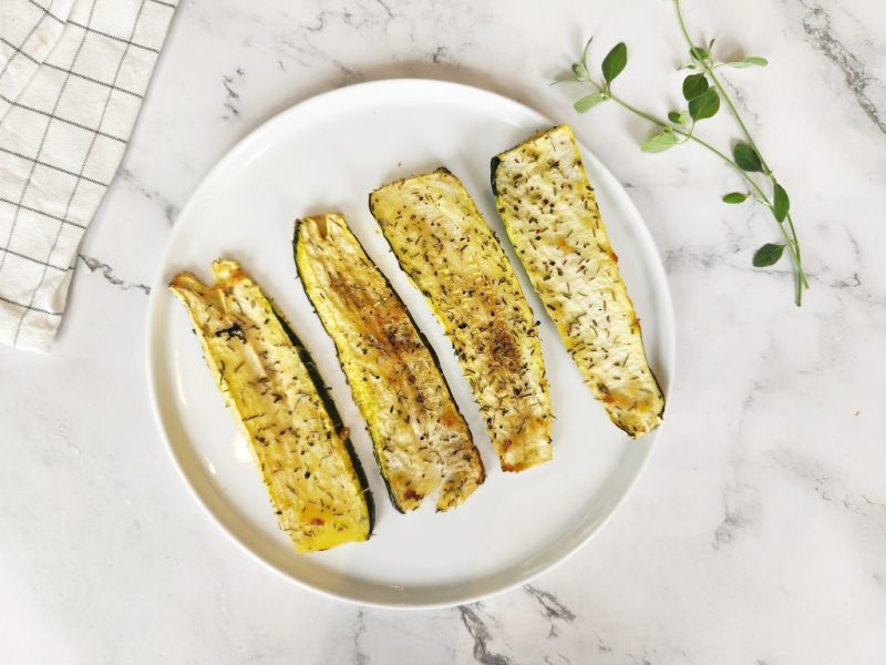 - חותכים את הזוקיני לאורך לפרוסות בעובי כ-1 ס”מ ומניחים בתבנית על נייר אפיה.