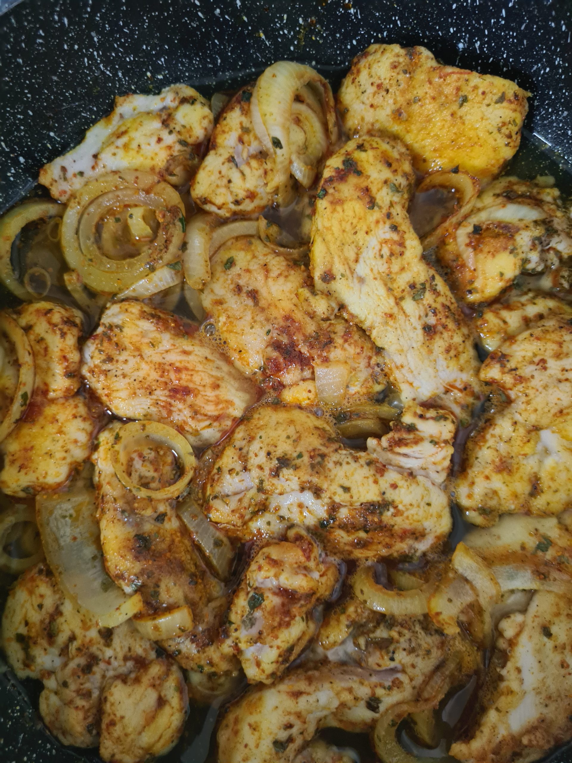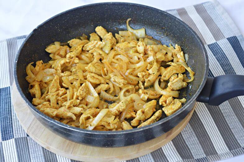 - מוסיפים את חזה העוף ומתבלים בפפריקה מתוקה, כמון, כורכום, מלח, פלפל שחור ותבלין פטרוזיליה/כוסברה. מערבבים במשך כ-5 דקות ומסירים מהאש (מומלץ לטעום ולשפר תיבול לפי הטעם).