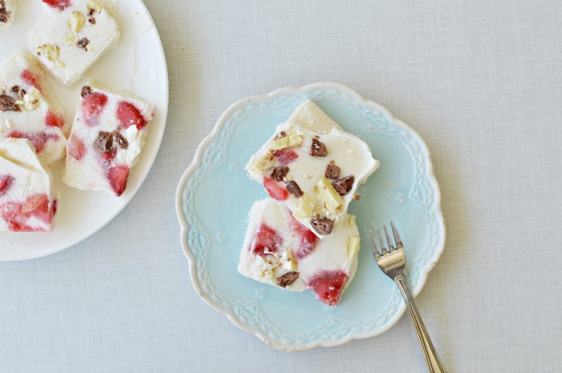- מפזרים מעל חתיכות תותים ושוקולד קצוץ . מכסים את התבנית ומכניסים למקפיא במשך 5-6 שעות לפחות, עד שזה קופא לגמרי.