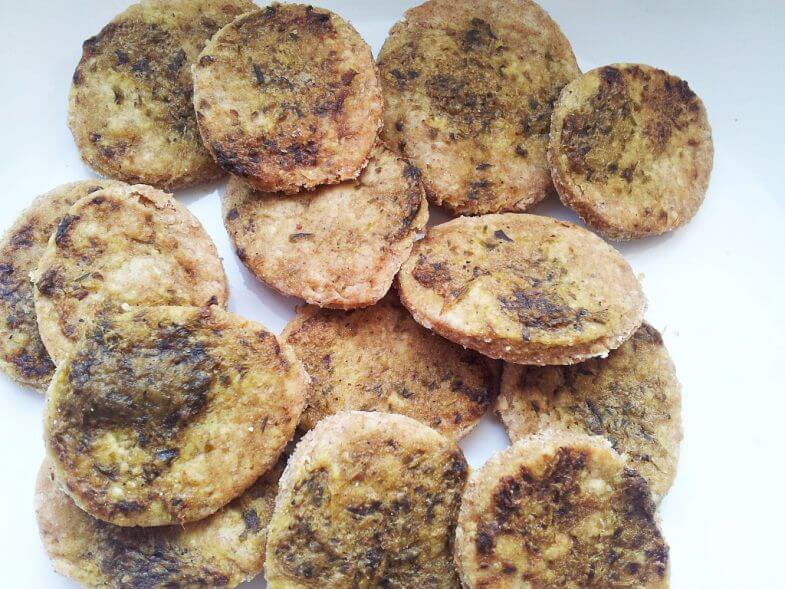 - מניחים את העיגולים על נייר אפייה ומורחים מעליהם רוטב פסטו. אופים בתנור 15-20 דקות עד שהקרקרים מזהיבים. מוציאים ומצננים.