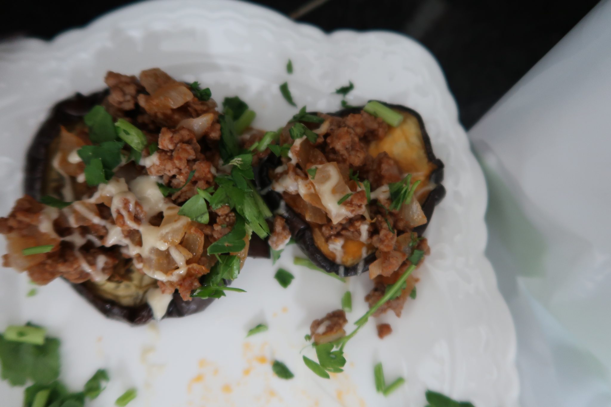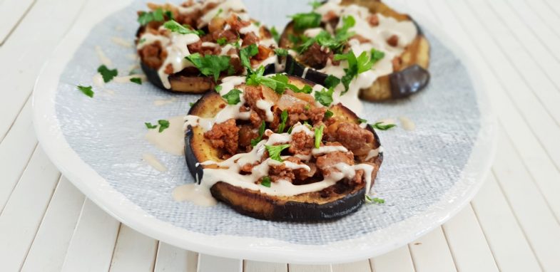 - מניחים מעל כל פרוסת חציל 1-2 כפות מתערובת הבשר, מזלפים מעל טחינה ומפזרים פטרוזיליה קצוצה.