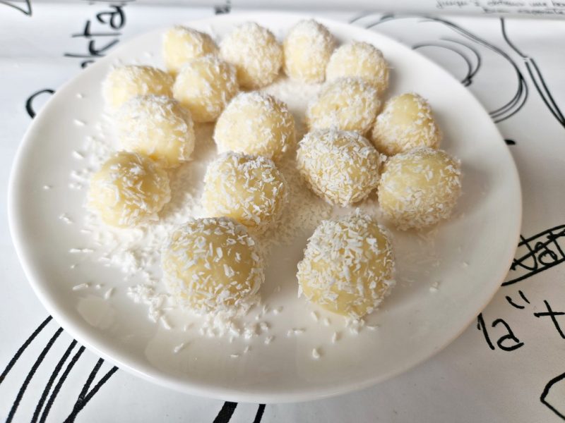 - משתמשים בכפית כדי ליצור עיגולים מהשוקולד ומגלגלים אותם במהירות בעזרת הידיים לכדורים קטנים בקוטר של כ- 2 ס”מ. מגלגלים בקוקוס.