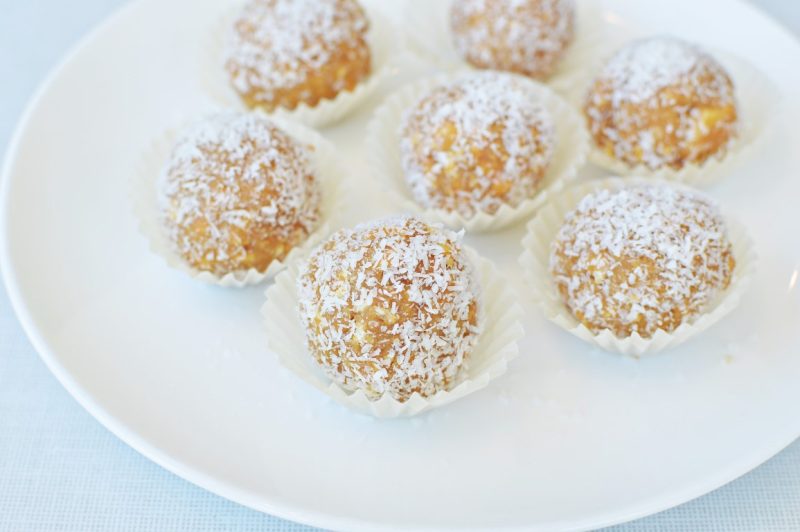 - בעזרת הידיים יוצרים כדורים וטובלים בתוך צלחת קטנה עם קוקוס.
