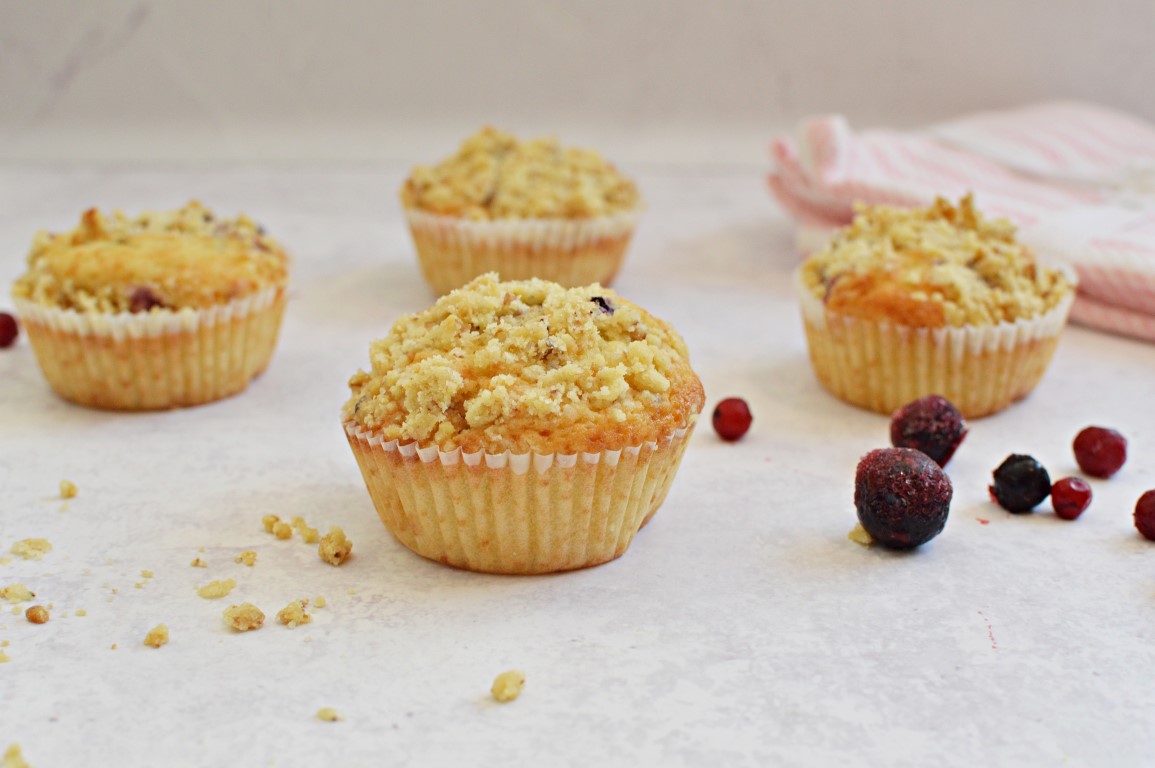 - יוצקים את הבלילה לתבנית מאפינס. מניחים בחלק העליון מעט אוכמניות ומפזרים מעל את פירורי הקראמבל.