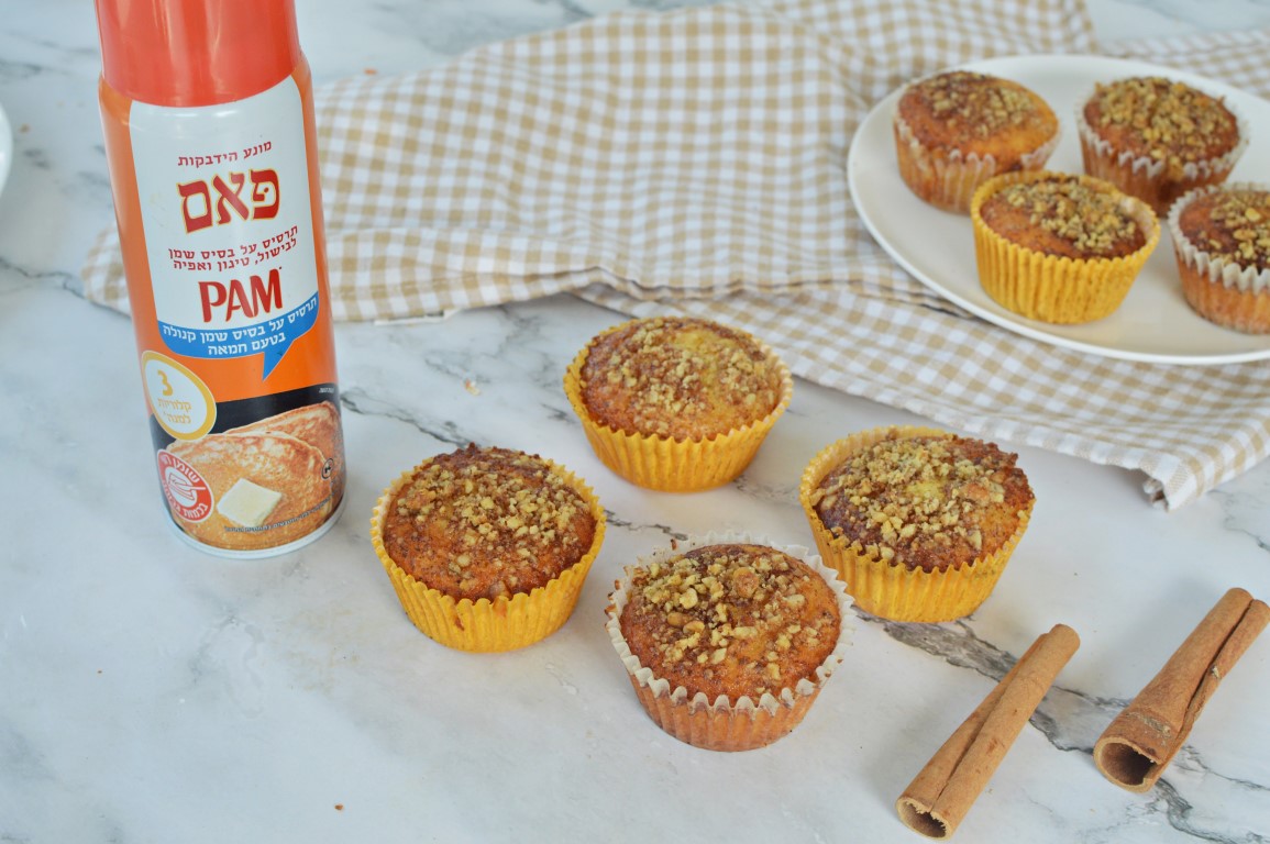 - מתיזים תרסיס שמן של פאם בתוך השקעים של תבנית המאפינס ויוצקים את הבלילה באופן שווה.