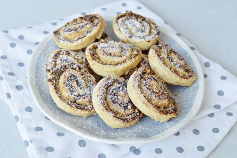 - מגלגלים את הבצק בעדינות לרולדה וחותכים את הרולדה לפרוסות בעובי כ-1.5 ס”מ (אם הבצק רך מידי לחיתוך אפשר להכניס את הרולדה למקפיא למשך כרבע שעה לפני שחותכים).