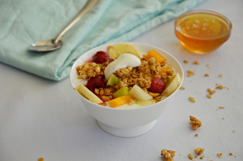 - מפזרים פירות חתוכים וגרנולה. מזלפים מעל מעט דבש או מייפל לפי הטעם.