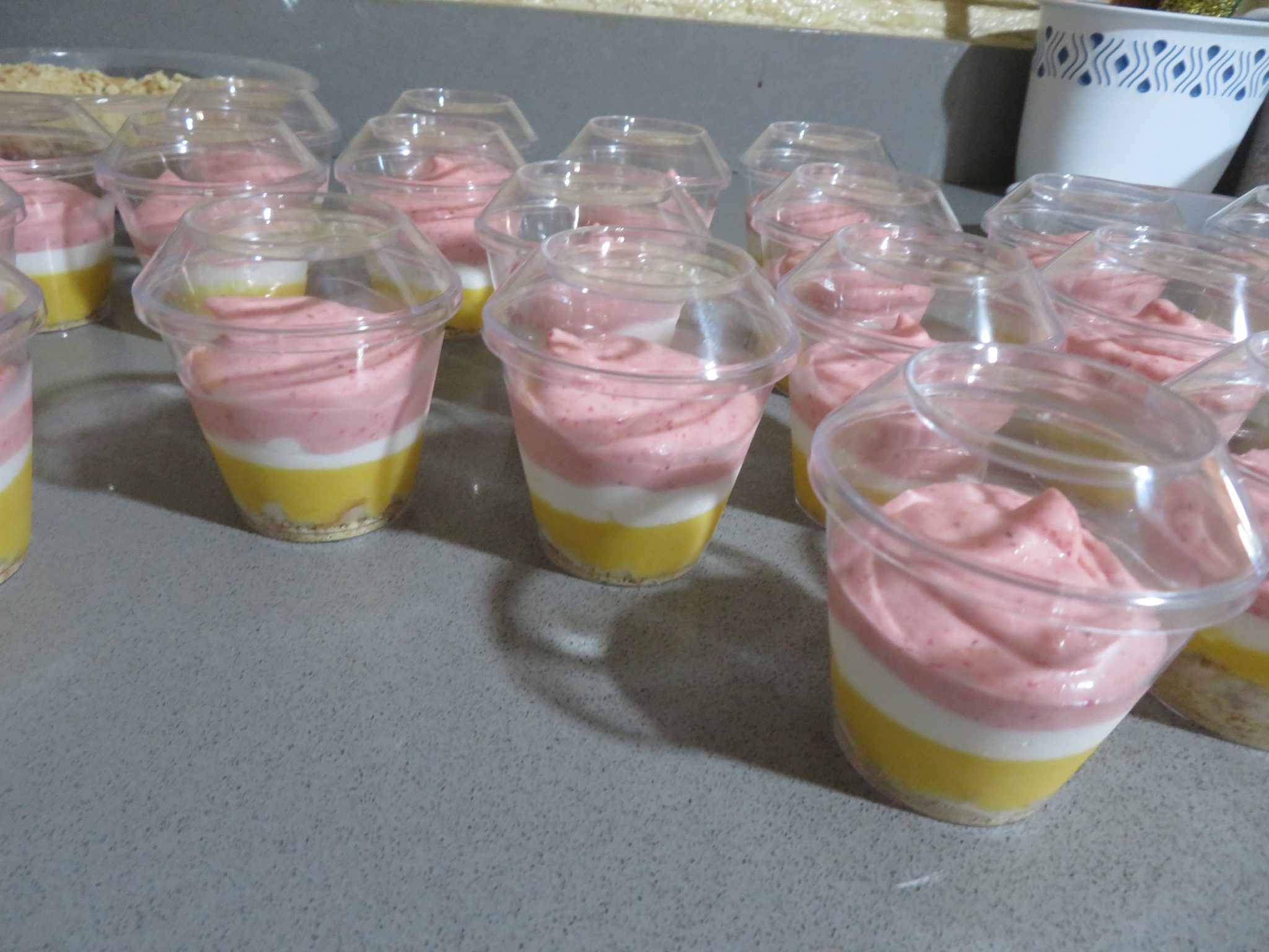 - מעצבים כל כוס באופן הבא: פירורי ביסקוויטים בתחתית, מעל מוס מנגו, מחית מנגו, מוס מנגו ומחית מנגו.