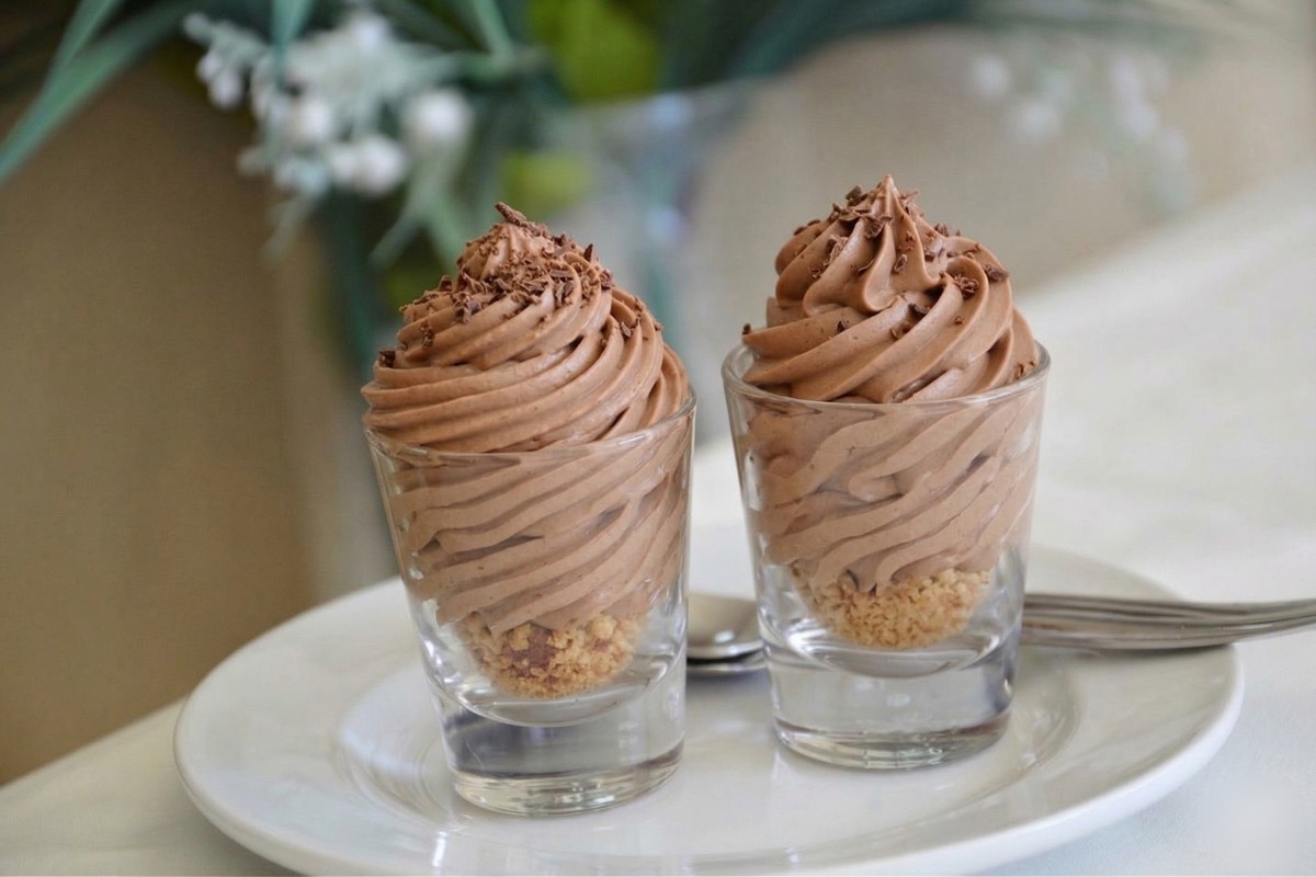 - מניחים בגביע שכבה של פירורי ביסקוויטים ועליה יוצקים את קצפת השוקולד. מפזרים מעל מעט שוקולד מריר מגורד.