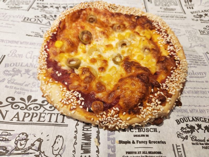 - מניחים מלוואח על נייר אפיה ומורחים מעל רוטב פיצה (משאירים שוליים נקיים). מפזרים גבינה צהובה ותוספות שאוהבים. מפזרים שומשום על השוליים.