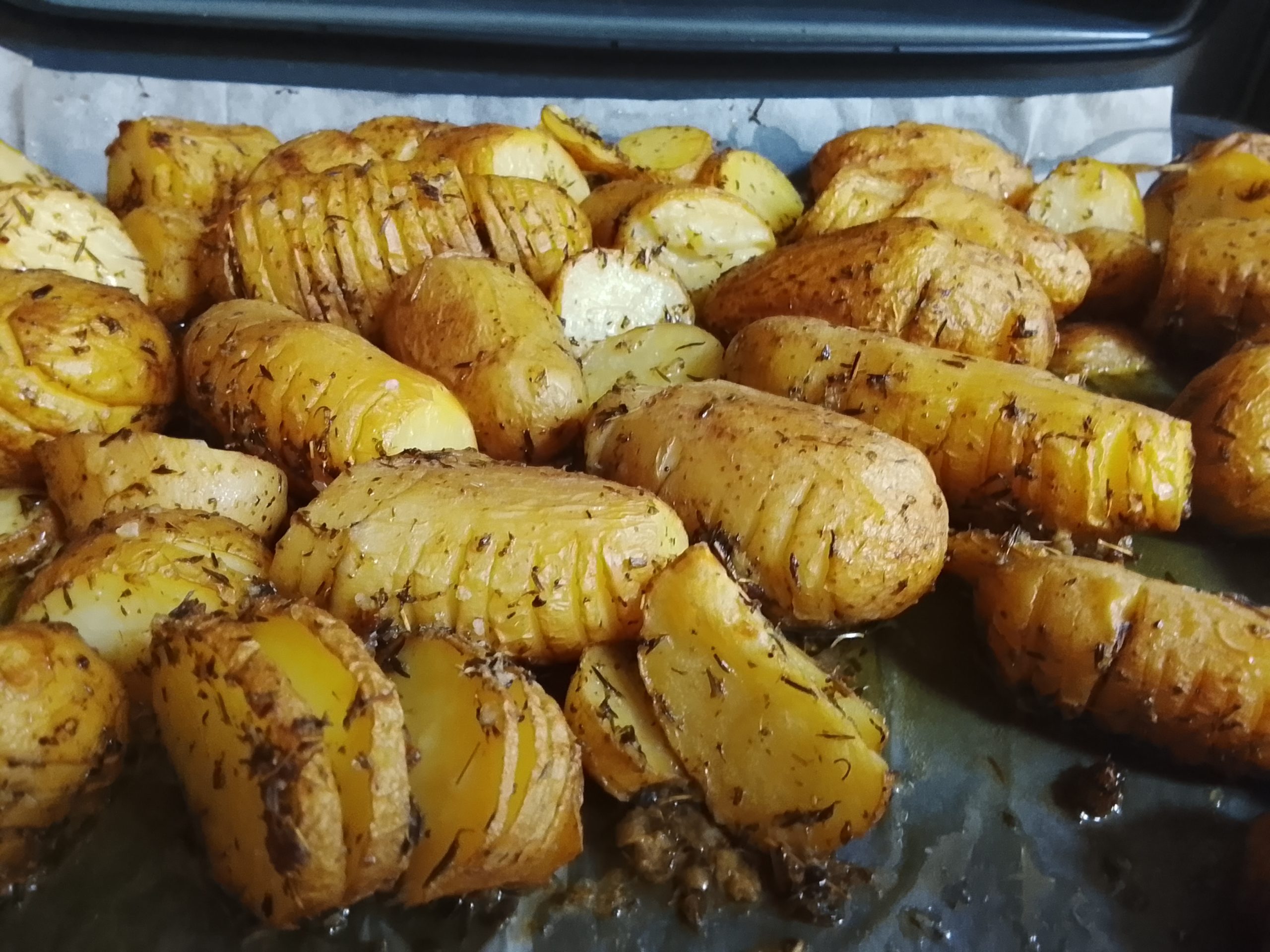 - מערבבים את כל שאר החומרים בקערית. מניחים את תפוחי האדמה הפרוסים בתבנית על נייר אפיה ומורחים את התערובת בין הפרוסות.