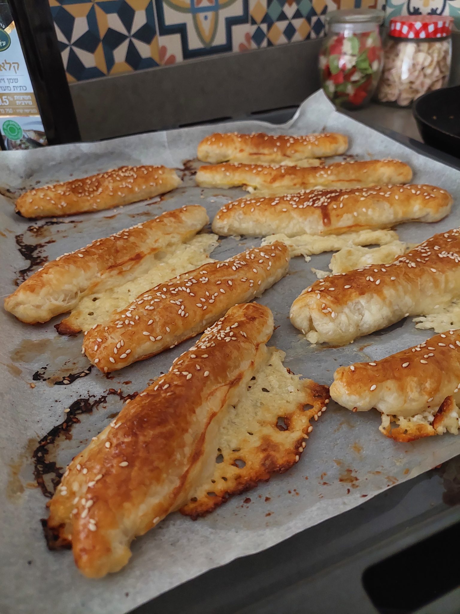 - מניחים את המקלות על תבנית מרופדת בנייר אפיה כאשר הצד אותו הידקנו נמצא כלפי מטה. מברישים בביצה טרופה ומפזרים שומשום ו/או קצח.