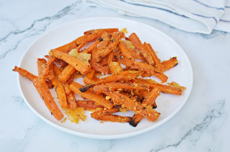 - מוציאים את התבנית מהתנור, מפזרים על הגזרים גבינת פרמז’ן מפוררת ומחזירים לתנור למשך 15 דקות נוספות.
