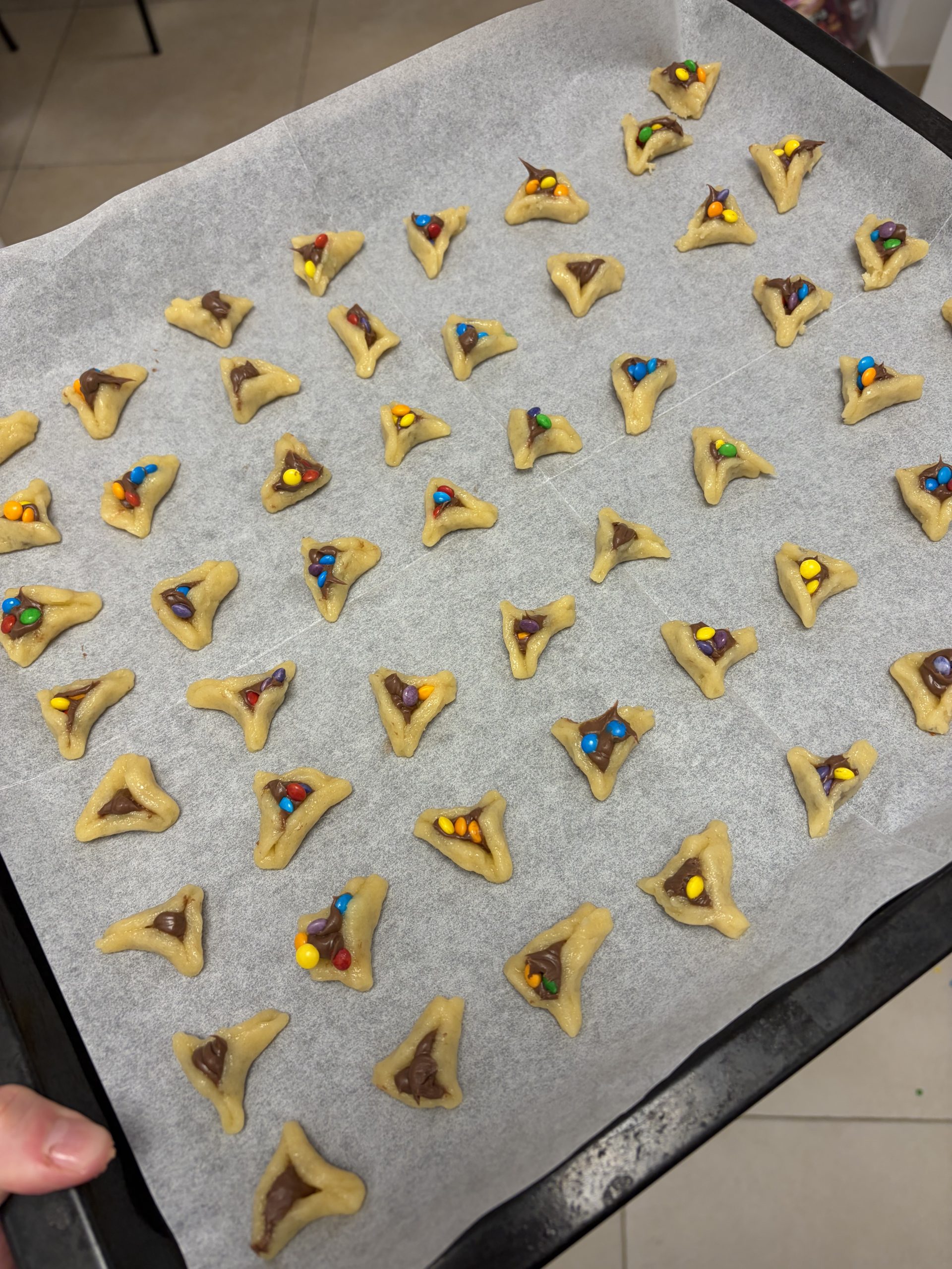 - הדקו היטב את הקצוות כדי שאוזני המן לא ייפתחו באפייה - צבטו כל פינה בלחיצה חזקה עם שתי אצבעות, וודאו שאין פערים בין חלקי הבצק. אם הבצק מתקשה להיסגר, הרטיבו מעט את הקצוות במים - זה יעזור להם להידבק. טיפ נוסף: הכניסו את אוזני המן למקפיא ל-10 דקות לפני האפייה, ככה הצורה נשמרת מושלמת בתנור.