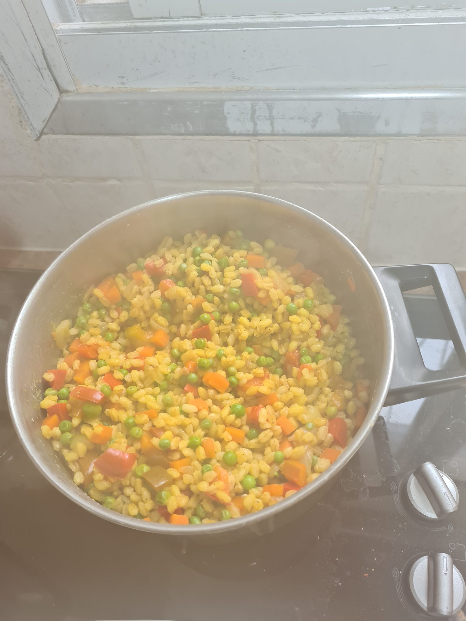 - מוסיפים אפונה וסלרי (גבעול+עלים) ומערבבים כדקה. מוסיפים את החיטה ומתבלים במלח, אבקת מרק, כמון, כורכום, פלפל שחור ותבלין יבש.