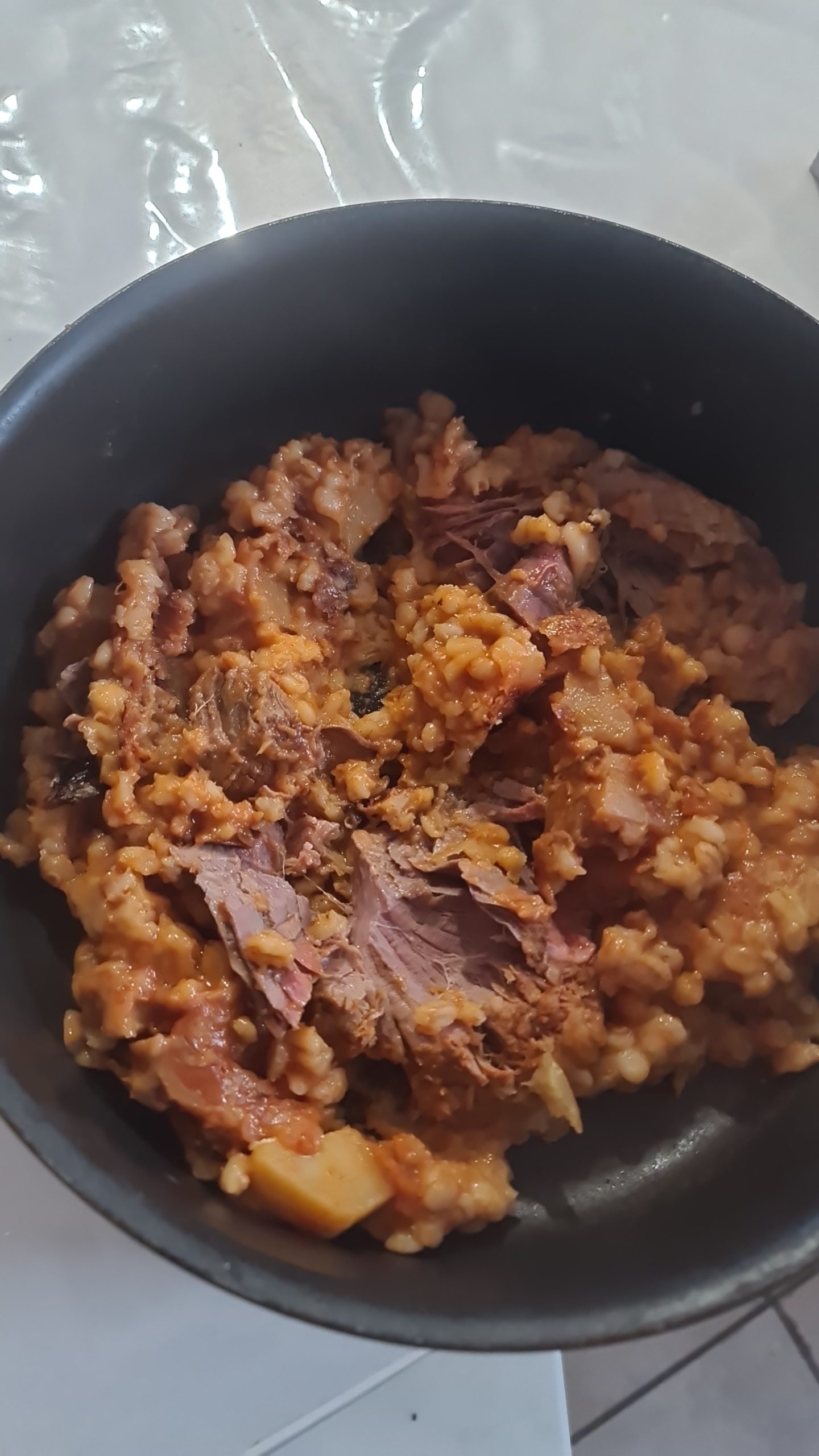 - מוסיפים את תפוחי האדמה והבשר ומערבבים.
