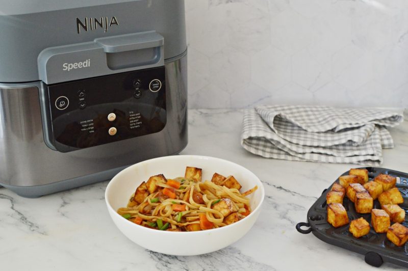 - לאחר שזה סיים, פותחים את המכשיר, מסירים בזהירות את צלחת הטיגון עם הטופו ומערבבים את הנודלס עם הירקות. מגישים עם הטופו.