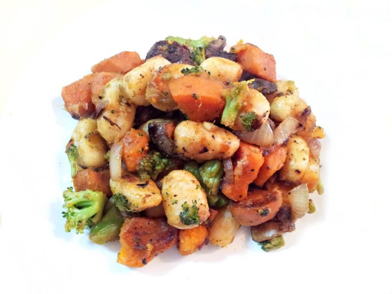 - מטגנים עם שמן זית את הבצל עד להזהבה קלה. מוסיפים את השום, הפטריות והבטטה. ממליחים מעט (המלח מזרז את הבישול), מכסים ומבשלים עד שהבטטה מתרככת. מוסיפים את הברוקולי ומתבלים. מערבבים ומבשלים כ-2 דקות. מוסיפים את הניוקי המבושל ומערבבים היטב עד לספיגת הטעמים בניוקי.