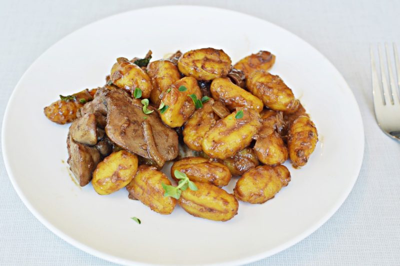 - מכינים את הניוקי לפי הוראות אריזה ומעבירים למסננת (בדר”כ 2 דקות בישול במים רותחים, עד שהניוקי צפים).