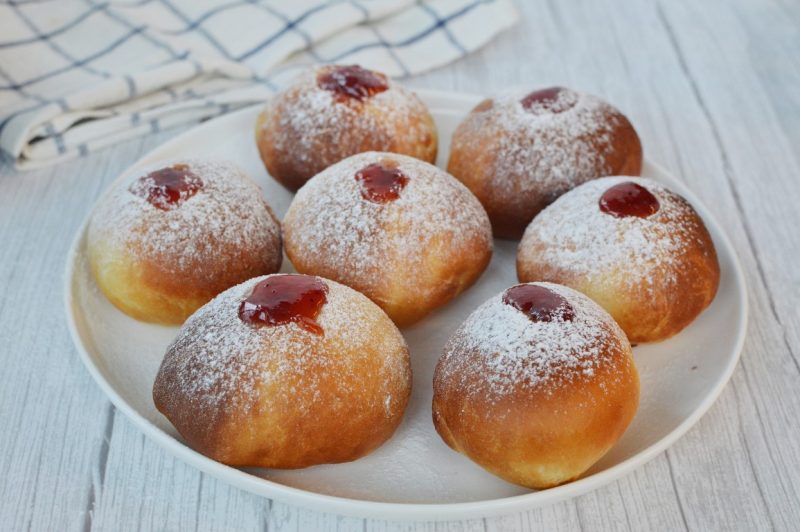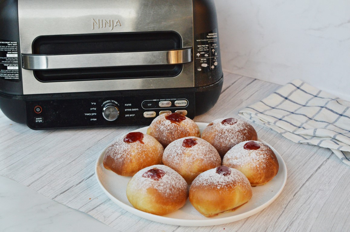 - לאחר סיום פעולת המכשיר, מברישים שוב בשמן. מצננים מעט, ממלאים בריבה ומפזרים אבקת סוכר.