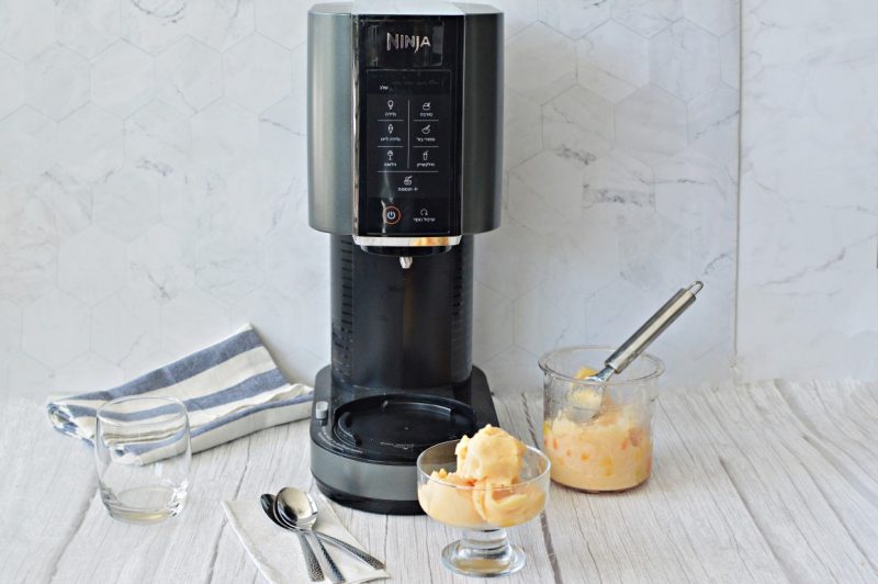 - -מוציאים את הכוס מהמקפיא ומסירים את המכסה. מכניסים את כוס הערבול למכשיר הנינג’ה קרימי ובוחרים בתוכנית “סורבה”.