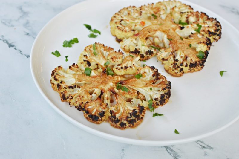 - מניחים את פרוסות הכרובית בתבנית על נייר אפיה ומתבלים ברוטב משני הצדדים באופן אחיד.
