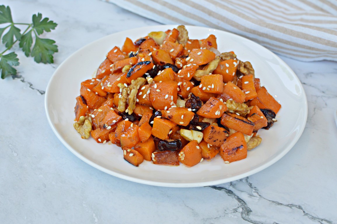 הבטטה במתכון מספקת 400% מהמנה היומית של ויטמין A הודות לבטא קרוטן הכתום שלה! היא עשירה גם באשלגן (850 מ”ג למנה) לבריאות הלב, ומגנזיום לחיזוק השרירים. אגוזי המלך תורמים חלבון צמחי, אומגה 3 בריא, וויטמין E נוגד חמצון.